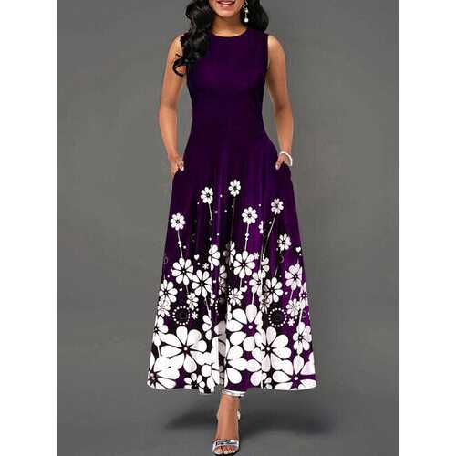 FABRIC: PolyesterSpecification :Color: Black,Purple,NavyCustomer Age: 26-35 Years,36-45 YearsSize: M,L,XL,2XLClosure Type: Zipper FlyMaterial: PolyesterPattern: Printed,FloralSleeve Length: Sleeveless Occasion: Work,Party,SexyDress Length: Mid-CalfNeckline: O-neckSilhouette: A-LineSeason: Spring,Summer,Autumn,Winter Package included: 1*Dress