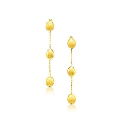 Three beautiful pebbles in polished and textured style showcase the simple elegance of these dangling earrings. Positively gorgeous in 14k yellow gold.Rhodium Polish: NoLine Item Type: GoldMetal Name: Yellow GoldMetal Content: 14KStyle Name: DanglingBacking: Push BackLength: 2.00 inWidth: 0.25 in
