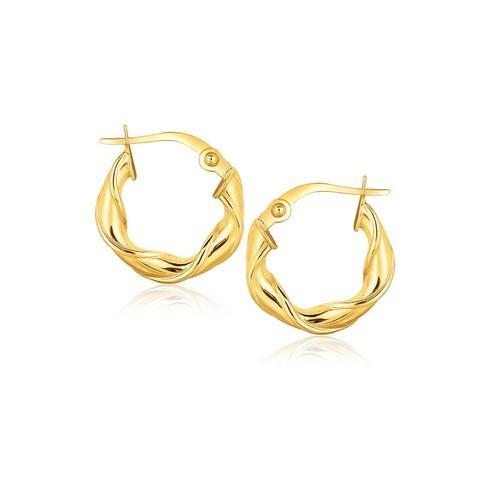 These twist hoop earrings are crafted in 14k yellow gold and measure 5/8 inch length and width, featuring a snap lock backing.Rhodium Polish: NoLine Item Type: GoldMetal Name: Yellow GoldMetal Content: 14KStyle Name: HoopsBacking: Snap LockLength: 0.63 inWidth: 0.63 in
