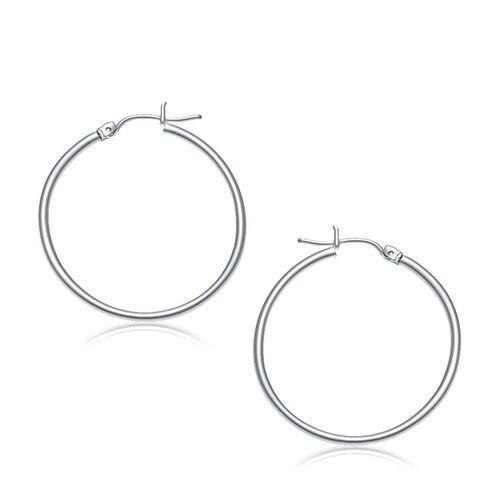 These timeless hoop earrings are crafted in 14k white gold and measure 30 millimeters in diameter, featuring a snap lock backing.Rhodium Polish: NoLine Item Type: GoldMetal Name: White GoldMetal Content: 14KStyle Name: HoopsBacking: Snap LockDiameter: 1.18 inLength: 1.18 inWidth: 0.08 in