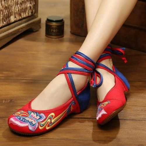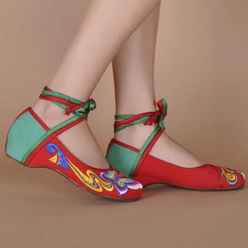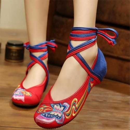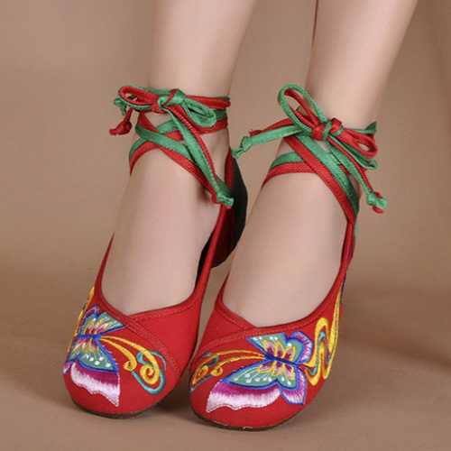 Butterfly Knot Embroidery Color Match National Wind Lace Up Strappy Flat Shoes