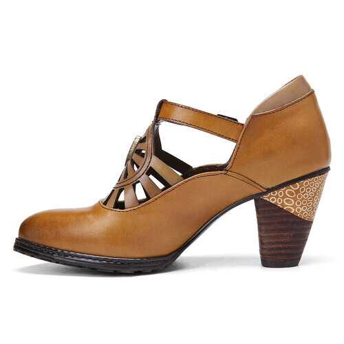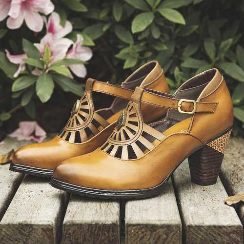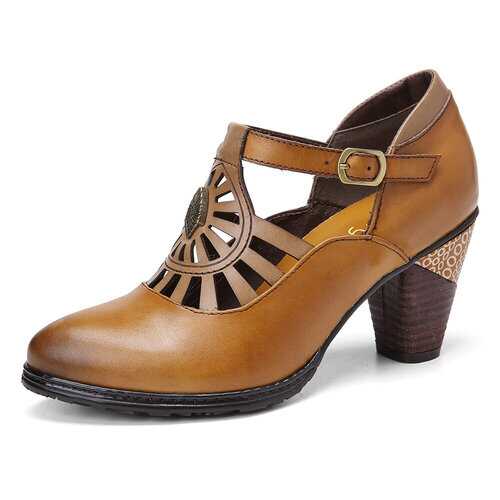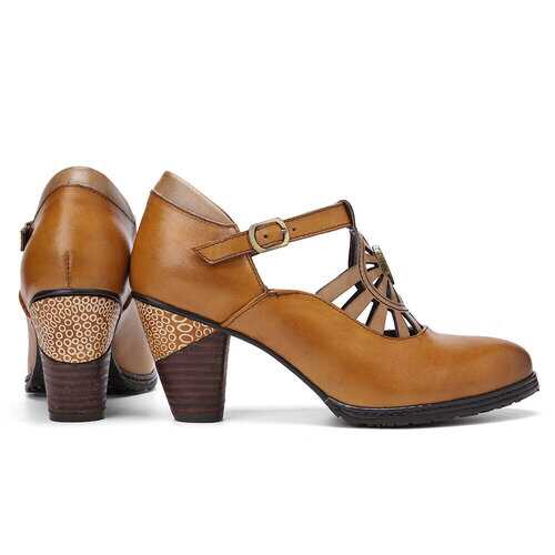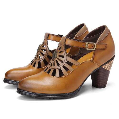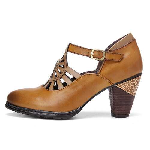 Brand: SOCOFY   Shoe Type: Pumps Heel Height: 5.0 cm / 2 in Heel Type: Mid-heel/Chunky Heel/Stacked Heel Closure Type: Buckle Toe Style: Pointed Toe Strap Type: Ankle-strap Special Features: Cut-out/Charms Pattern Style: Solid Gender: Female Occasions: Casual, Office, Holiday Season: Spring, Summer, Autumn Color: Camel Size (EU): 36-42   Material: Upper: Leather Lining: PU Outsole: Non-slip Rubber   Package included: 1*pair of shoes (packing in a carton case)   ▲KINDLY NOTICE: 1.There Is 2-3% Difference According to Manual Measurement. 2.We Suggest You Choose Size According to Foot Length and Foot Width. Please Check the Measurement Chart Carefully Before You Buy the Item (1 Inch = 2.54 cm). 3. Please Note That Slight Color Difference Should Be Acceptable Due to The Light and Screen. As These Shoes Are Hand-colored, There May Be A Certain Odor. 4. These are handmade products so it may take more time to produce than other shoes and  5. After Receiving the Goods, Putting Them in A Well-ventilated Place Can Eliminate the smell. 6.The Shoes Are Genuine Leather Products That Are Able to Have A Little Contact with Water, but They Cannot Be Soaked in Water for a Long Time.   ▲TIPS: Two Ways to Break in New Shoes Without Rubbing Your Feet 1. Stretch the Backs of Your Shoes with Warm Air by Using the Hairdryer. 2. Roll on Some Deodorant or Soap to Prevent Rubbing and Smell.