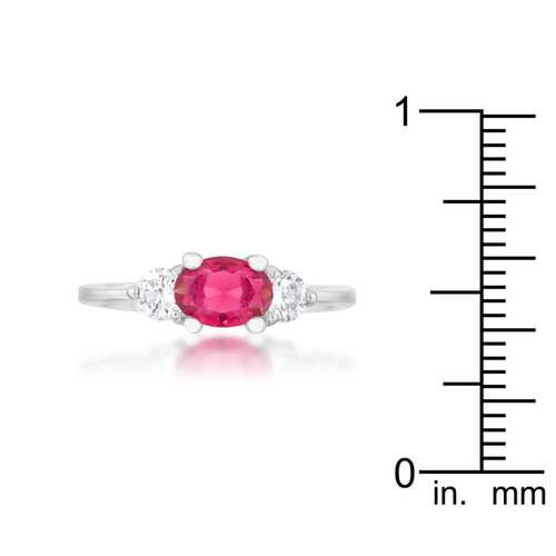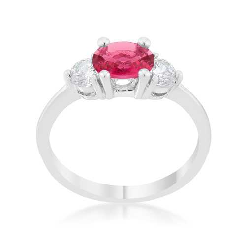 A pair of clear round cut stones accompany a fuchsia oval cut center stone in this elegantly simple 1.2 carat engagement ring.Base Metal: Lead Free Alloy (brass)Style: , Setting Type: ProngsMaterials: , Stone Cut: OvalPlating Color: RhodiumRing Band Width: 2mmStone Size: 3.75 Mm