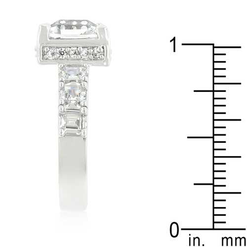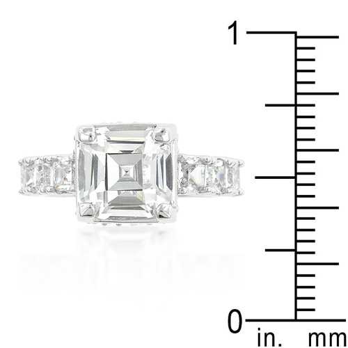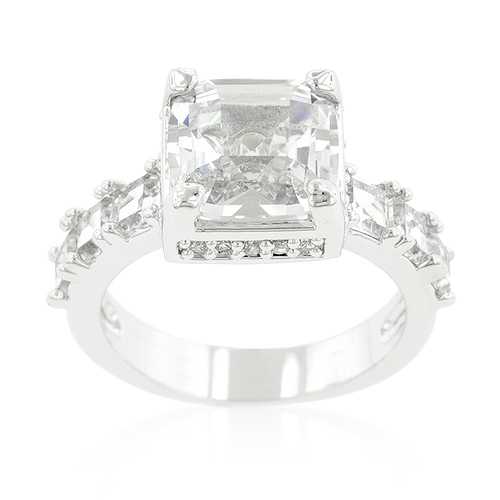 This striking asscher cut engagement ring makes a bold statement in silver tone plating. Our genuine rhodium finish is achieved using an electroplating process that coats the item with heavy layers of rhodium a close cousin to platinum which gives our jewelry a platinum luster.