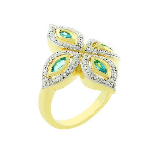 Aqua Luxe is two toned in gold and rhodium with a marquise clover shape. The leaves are inlaid with aqua crystals and trimmed with milgrain rhodium accent. The main body of the ring is gold tone and designed with a contemporary philosophy. Our two-tone and tri-tone process use 18k gold...