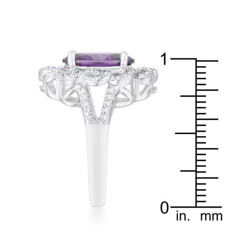Clear finely cut stones twist in an elegant design accenting an amethyst center stone in this classic 8.5 carat ring. Our genuine rhodium finish is achieved using an electroplating process that coats the item with heavy layers of rhodium a close cousin to platinum. This gives our jewelry a platinum luster.