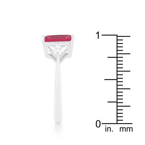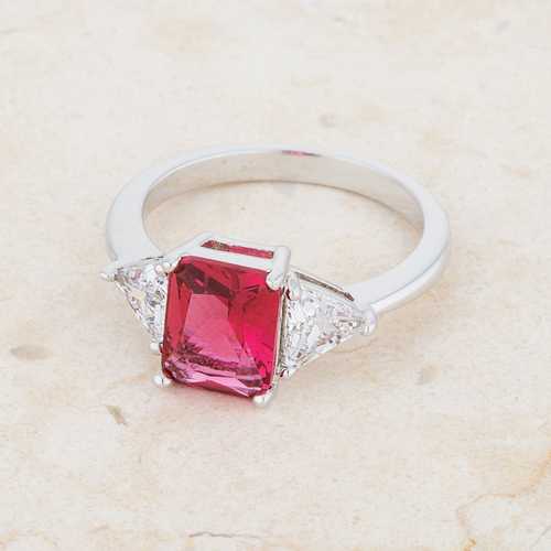 A pair of clear trillion cut stones accompany a fuchsia radiant cut center stone in this elegant 4.5ct CZ engagement ring. A modern twist on a classic piece. Our genuine rhodium finish is achieved using an electroplating process that coats the item with heavy layers of rhodium a close cousin...