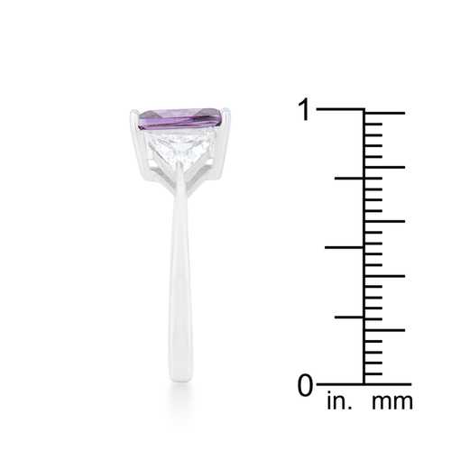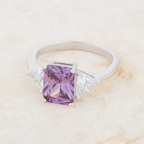 A pair of clear trillion cut stones accompany an amethyst radiant cut center stone in this elegant 4.5ct CZ engagement ring. A modern twist on a classic piece. Our genuine rhodium finish is achieved using an electroplating process that coats the item with heavy layers of rhodium a close cousin to platinum. This gives our jewelry a platinum luster.