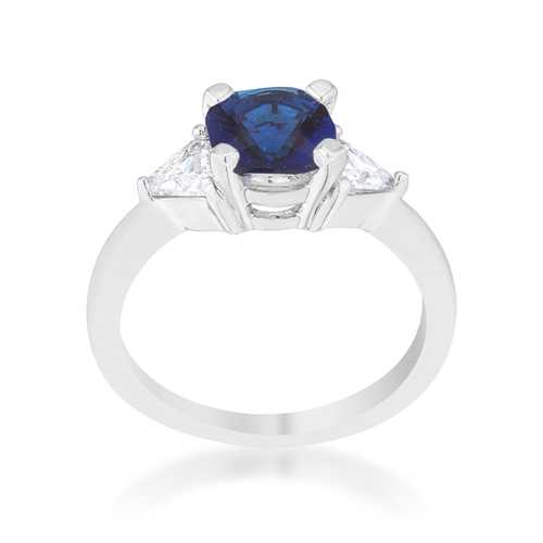 A pair of clear trillion cut stones accompany a sapphire cushion cut center stone in this elegantly simple 1.8 carat engagement ring. A modern twist on a classic piece.Base Metal: Lead Free Alloy (brass)Style: , Setting Type: ProngMaterials: , Stone Cut: Cushion|TrillionColor: , Plating Color: RhodiumRing Band Width: 2.2mmStone Size:...