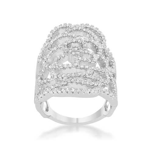 Small delicate stones accent the filigree design of a contemporary cocktail ring.Base Metal: Lead Free Alloy (brass)Style: , Setting Type: PaveMaterials: , Stone Cut: RoundColor: , Plating Color: RhodiumRing Band Width: 2.5 MmStone Size: 1.15 Mm