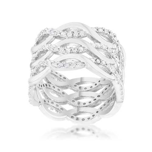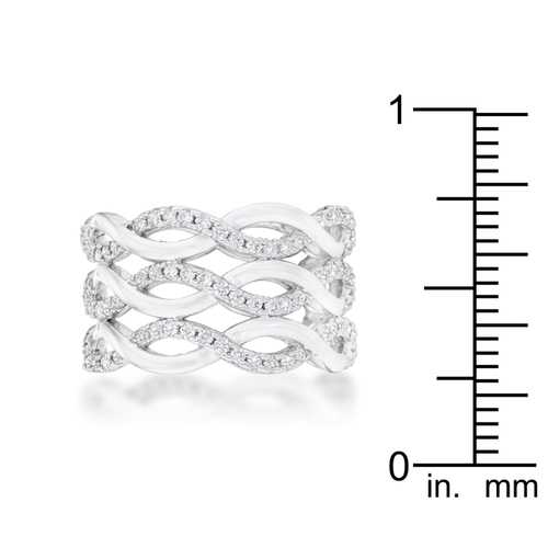 Three rows of twisted bands accent a wide contemporary-style cocktail band ring.Base Metal: Lead Free Alloy (brass)Style: , Setting Type: PaveMaterials: , Stone Cut: RoundPlating Color: RhodiumRing Band Width: 12 MmStone Size: 1.15 Mm