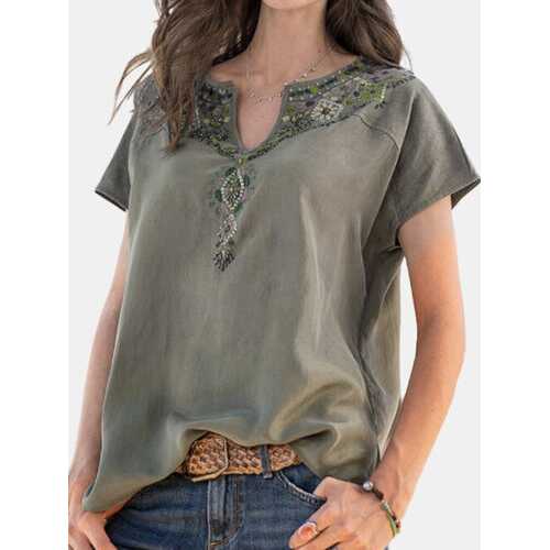 FABRIC: CottonSpecification :Color: Blue,Army,RoseCustomer Age: 26-35 Years,45+ Years,36-45 YearsSize: S,M,L,XL,2XL,3XLMaterial: CottonClosure Type: OverheadPattern: Floral,EmbroiderySleeve Length: Short SleeveOccasion: Daily Casual,HolidayNeckline: V-neckSeason: SummerPackage included:1*T-Shirt