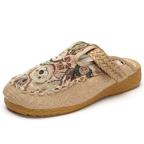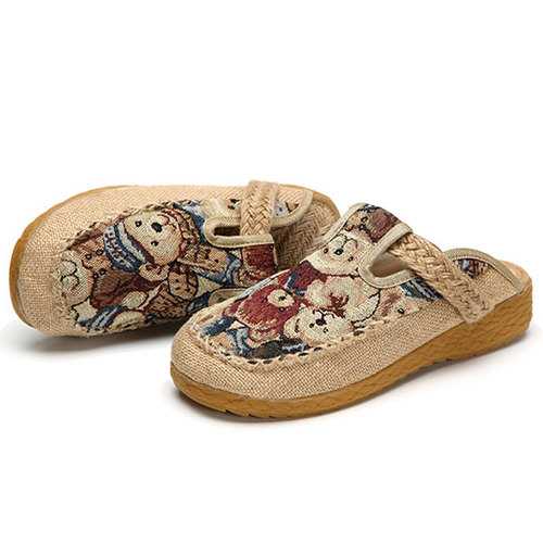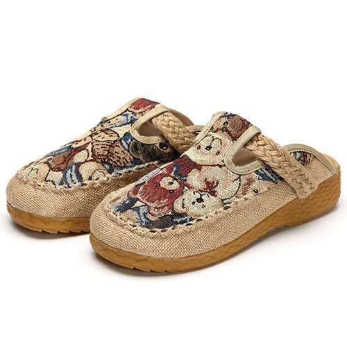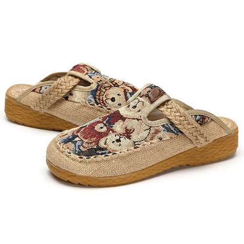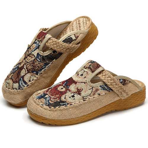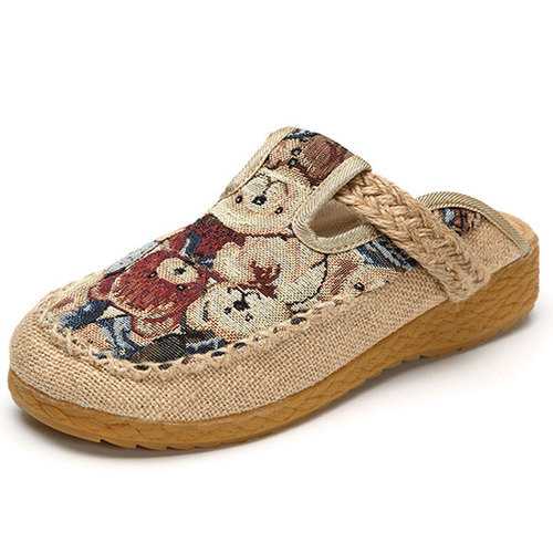 Women Flats Cartoon Flax Outdoor Embroidery Slipper