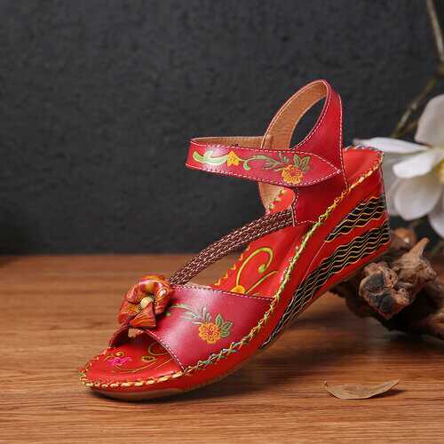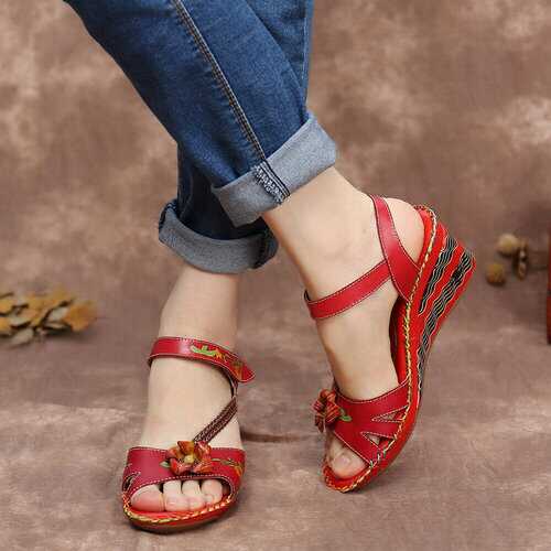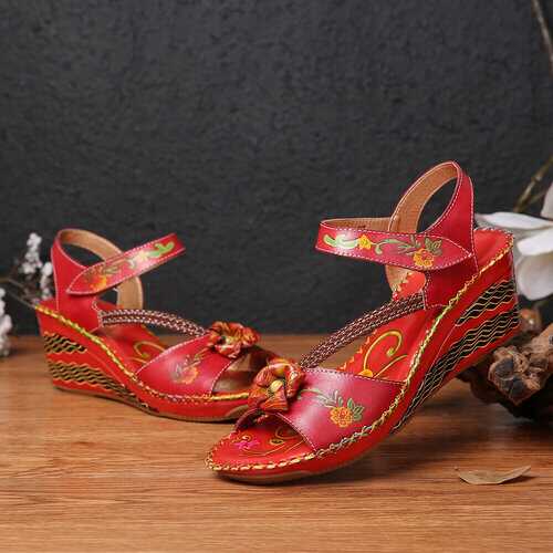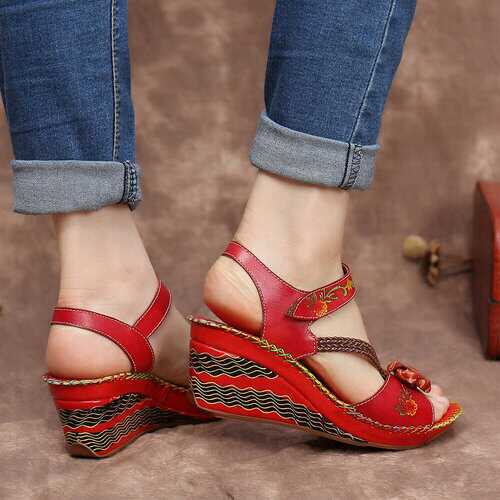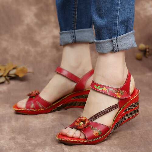 rand: SOCOFY Shoe Type: Wedge SandalsHeel Height: 6.0cm/2.36inHeel Type: Mid HeelClosure Type: Hook-and-loopToe Style: Open ToeStrap Type: Ankle-strapSpecial Features: Braided Strap/StitchingPattern Style: FloralGender: FemaleOccasions: Casual, Office, HolidaySeason: SummerColor:RedSize (EU): 36-42 Material:Upper: LeatherLining: PUOutsole: Rubber Package included:1*pair of shoes (packing in a carton case) ▲KINDLY NOTICE: