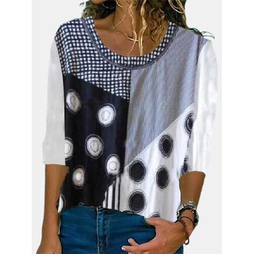 FABRIC: PolyesterSpecification :Color: WhiteCustomer Age: 26-35 Years,36-45 YearsSize: S,M,L,XL,2XL,3XL,4XL,5XLMaterial: PolyesterClosure Type: OverheadPattern: Printed,PatchworkSleeve Length: 3/4 SleeveOccasion: Daily CasualNeckline: O-neckSeason: Summer,AutumnPackage included:1*T-shirt