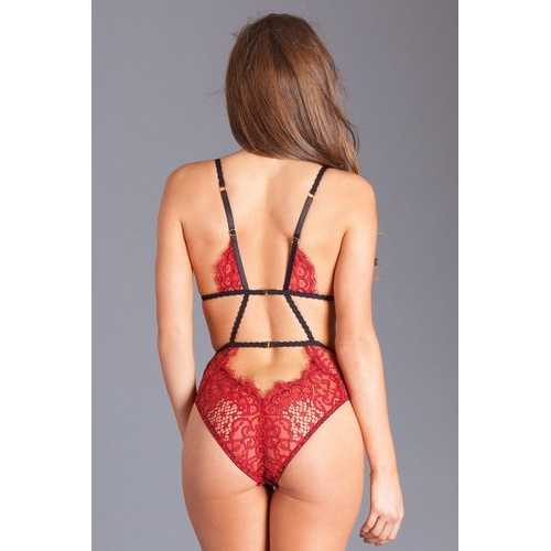 1PC semi-sheer lace open back brief cut teddy with plunge neck and eyelash trim Includes adjustable straps and hook fasteningsBoxed packaging Packaging dimensions (in): 10x7x1Size: LColor: Red